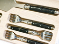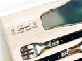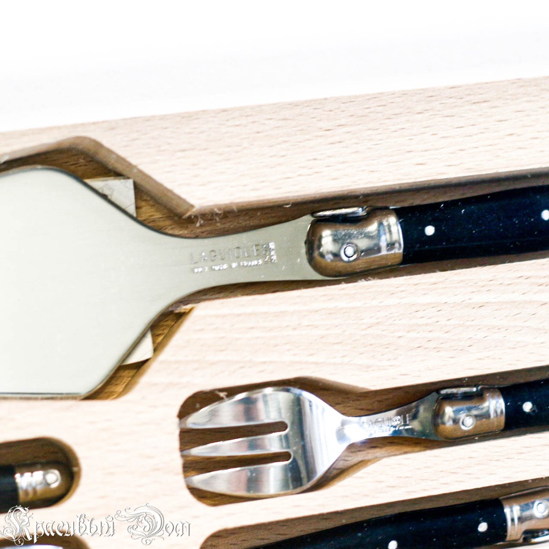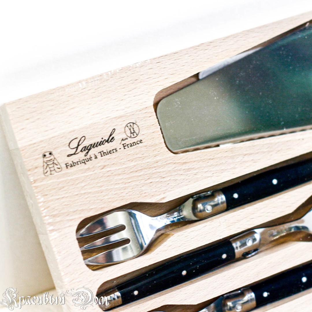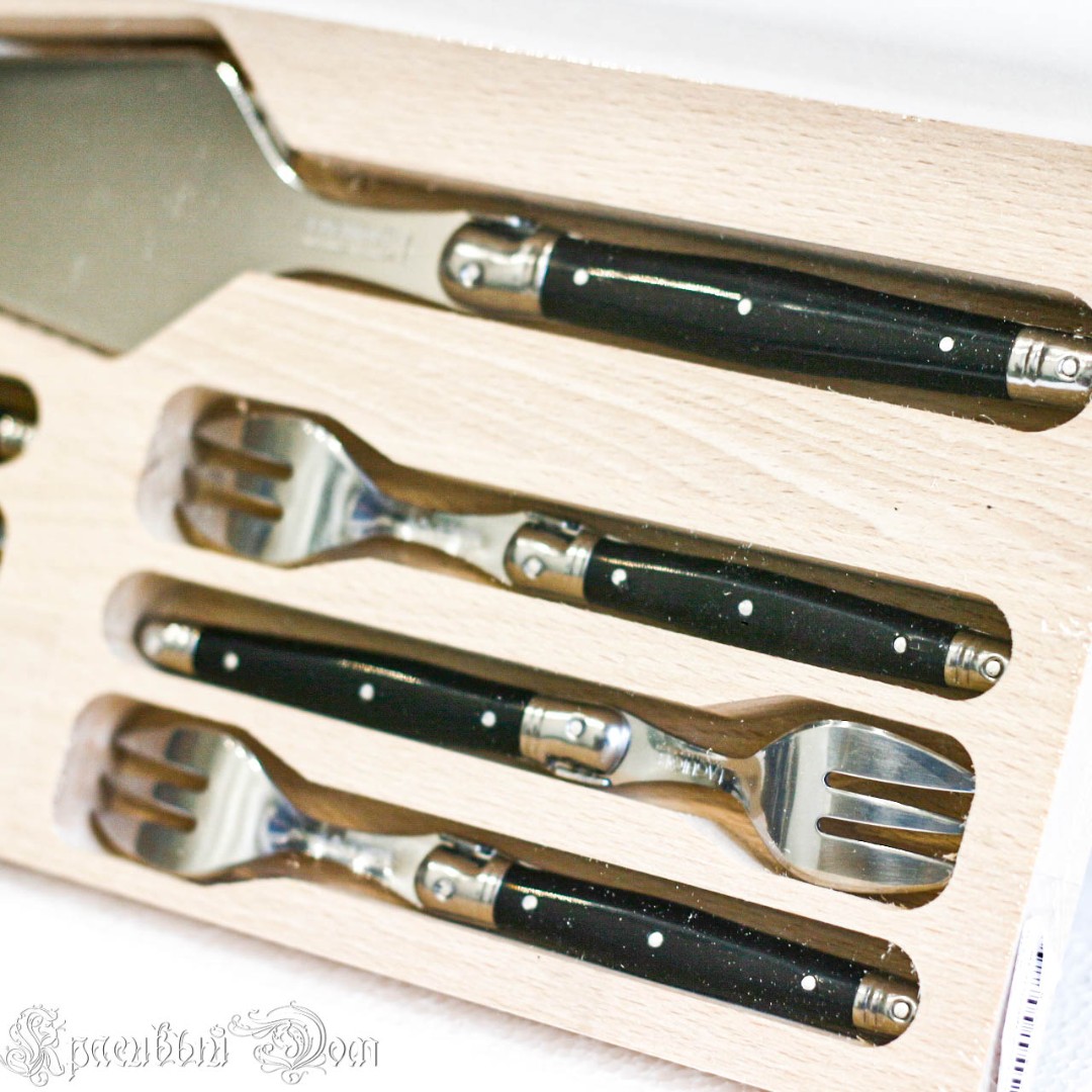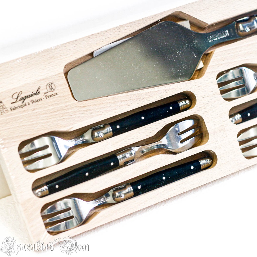 Комплект для десерта из 6 вилок и лопатки в деревянной коробке для хранения. С гравировкой «Laguiole». Лопатка с одной стороны заточена и имеет рифление для удобства резки.