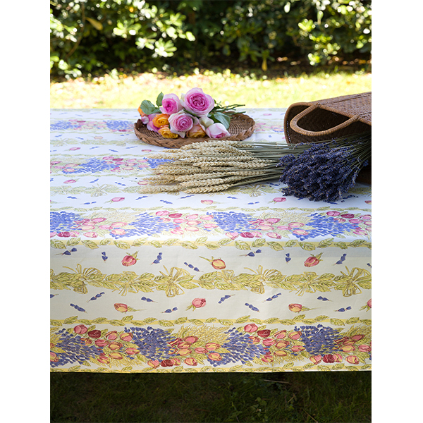 Хлопковая скатерть с акриловым пркрытием, позволяющим помыть скатерть прямо на столе. Произведена на Юге Франции — в Ницце. Создаёт уют, комфорт и практична в эксплуатации. Стирать при температуре 30°C. Гладить с обратной стороны. Изготавливается в размерах: круглая 180см, прямоугольная: 150х120см, 150х200см, 150х250см, 150х300см, 180х180см.