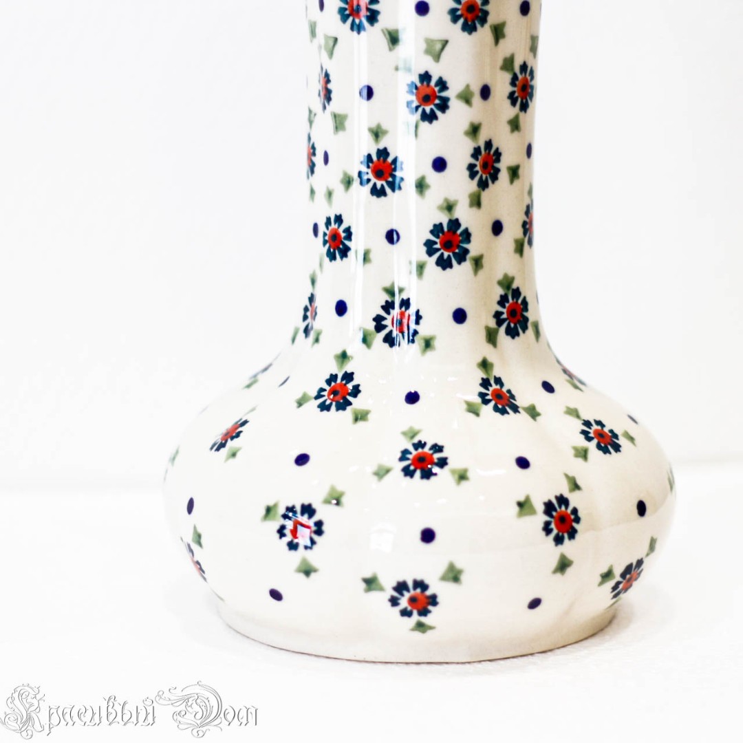 Высокая ваза сделана полностью вручную. Разноцветный цветочный принт создан прочными, стойкими к истиранию натуральными красками. Эта ваза надолго сохранит свой естественный эстетичный вид.